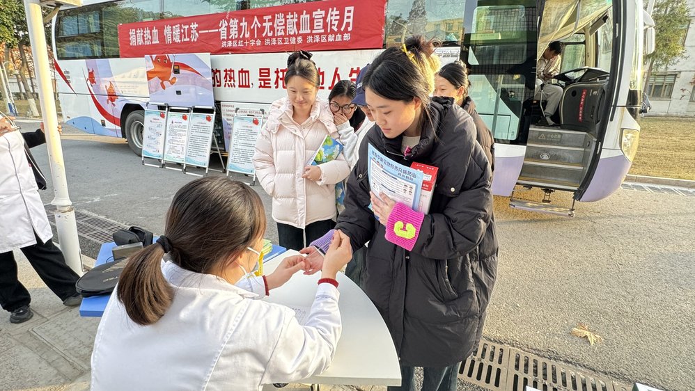 洪泽区疾控中心公共卫生专家结合冬季传染病高发特点,围绕甲流、腹泻等常见病症,系统讲解传播途径、典型症状及科学预防措施,强调勤洗手、常通风、规范佩戴口罩等防护要点。专家还现场示范消毒方法并答疑解惑,引导学生树立“早预防、早发现、早处置”的健康意识。讲座结束后,同学们有条不紊的进行着签到、填表、体检、验血等步骤,并自愿进行无偿献血。