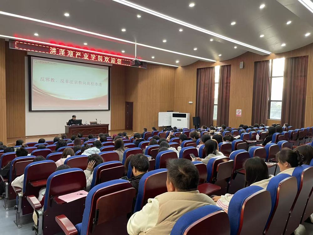 为筑牢校园安全屏障,防范邪教及非法宗教向高校渗透,近日,洪泽湖产业学院特邀淮安市公安局洪泽分局民警王凌玉,为全院师生开展“反邪教、反非法宗教渗透”主题知识讲座,切实将校园安全工作落到实处。
